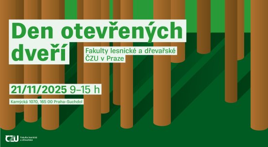 Srdečně Vás zveme na Den otevřených dveří Fakulty lesnické a dřevařské ČZU v Praze, který bude probíhat 21. 11. 2025 od 9.00 do 15.00 v areálu fakulty.