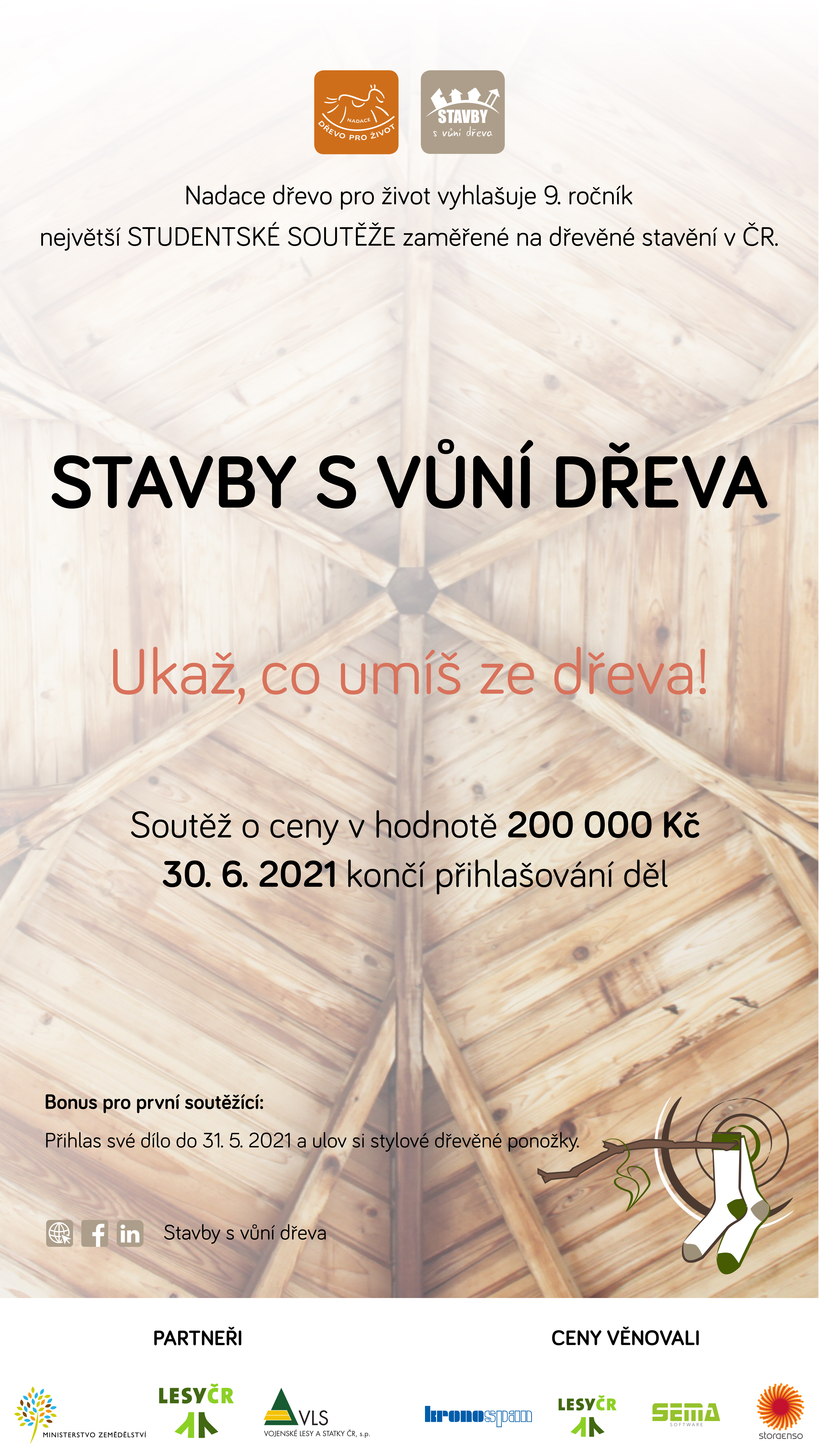 Máte rádi dřevo a ve škole navrhujete stavby? Přihlaste svůj návrh do největší české studentské soutěže zaměřené na dřevěné stavění „Stavby s vůní dřeva“, kterou po deváté vyhlašuje Nadace dřevo pro život. Laické i odborné veřejnosti ukážete svůj talent a zasoutěžíte si o poukaz na 50 000 Kč pro vítěze Cen odborné poroty a další ceny v celkové hodnotě 200 000 Kč! Uzávěrka přihlášek je 30. června 2021. Soutěž se koná se záštitou naší školy/fakulty.