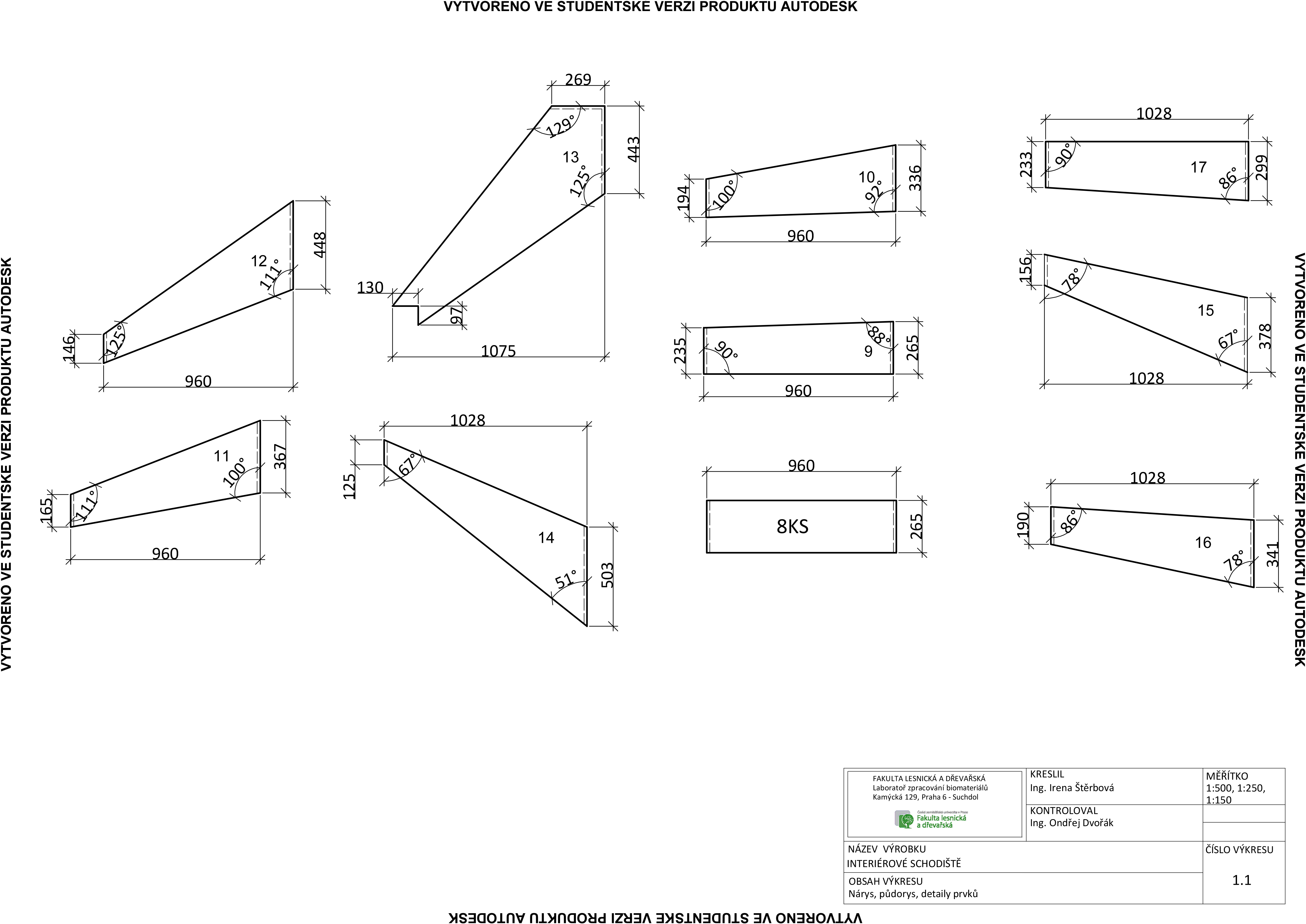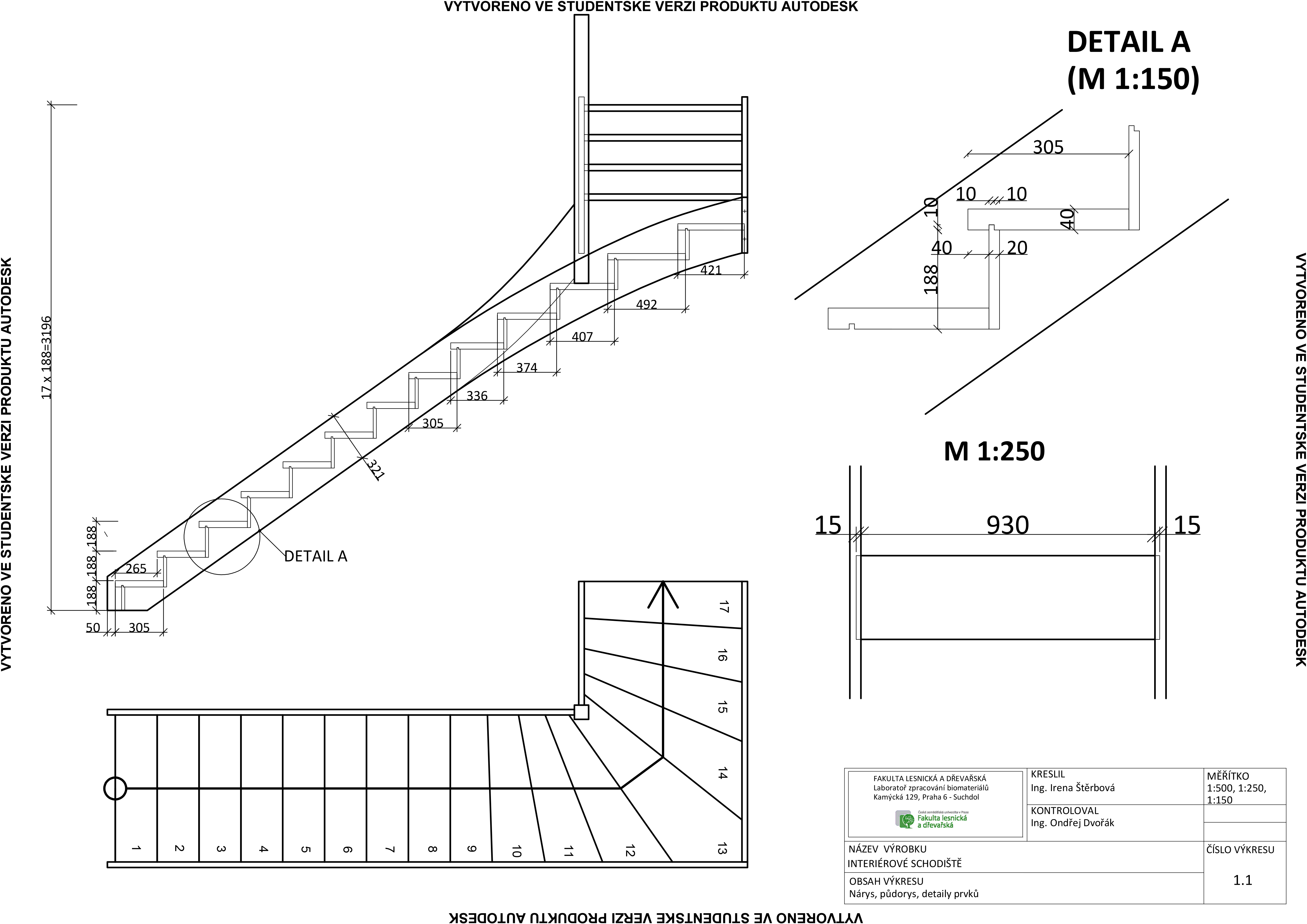 Bukové interiérové schodiště spojuje přírodní materiál s moderním parametrickým přístupem k navrhování. Schodiště bylo vyvinuto v rámci studijního programu Dřevařské inženýrství, jakožto ročníková práce studentů. Projekt vznikl za spolupráce Laboratoře zpracování biomateriálů Fakulty lesnické a dřevařské, která zabezpečila konstrukční stránku projektu a samotnou realizaci (O. Dvořák, T. Kytka, I. Štěrbová, K. Kubista, O. Machanec, P. Brejcha, F Cais) a fakultou architektury ČVUT, která připravila designérský návrh (L. Dvořáková).