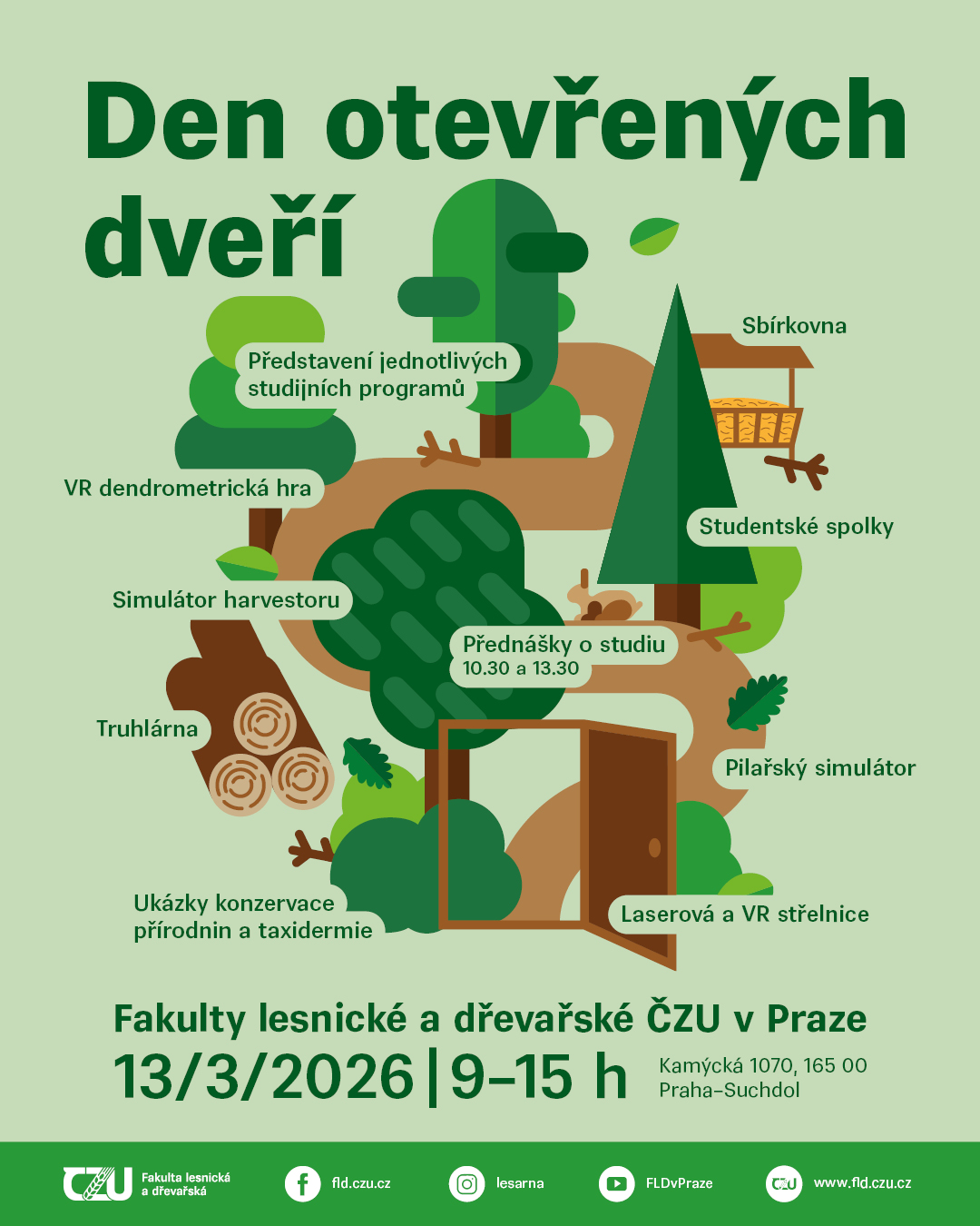Pedagogové i studenti ochotně odpovídali na otázky ohledně studia, výzkumu i praxe v oboru. Prezentovaly se též studentské spolky a Oddělení výzkumu rizik pro lesy. Zájemci si mohli na vlastní kůži vyzkoušet například simulátor harvestoru, „zastřílet“ si na digitální laserové střelnici či nahlédnout do Truhlárny. Nově si též mohli zahrát VR hru s dendrometickou tématikou a vyzkoušet pilařský simulátor nebo navštívit výstavu prací studentů z oboru Konzervace přírodnin a taxidermie v Knihovně ČZU. Součástí programu byly i přednášky o studiu na FLD, v nichž se uchazeči dozvěděli více o jednotlivých studijních programech, studentském životě i benefitech pro studenty.