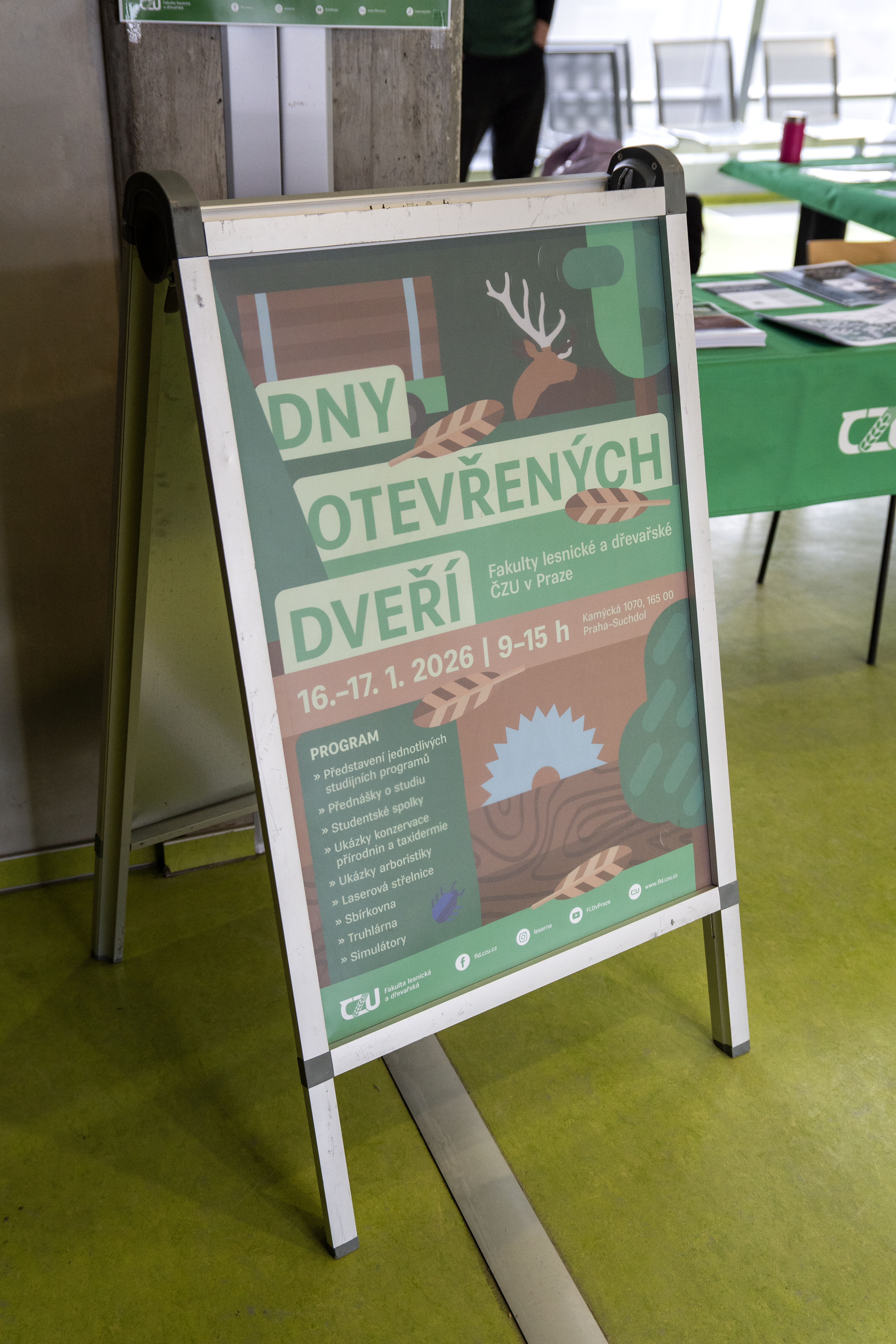 Ve dnech 16. a 17. ledna se na naší fakultě konal Den otevřených dveří. Areál fakulty se zaplnil studenty středních škol, rodiči i dalšími návštěvníky, kteří se přišli seznámit s možnostmi studia na naší fakultě. Návštěvníky čekal pestrý program, během něhož se mohli detailně seznámit s jednotlivými katedrami a jejich zaměřením. Pedagogové i studenti ochotně odpovídali na otázky ohledně studia, výzkumu i praxe v oboru. Prezentovaly se též studentské spolky a výzkumná oddělení. Zájemci si mohli na vlastní kůži vyzkoušet například simulátor harvestoru „zastřílet“ si na digitální laserové střelnici či nahlédnout do Truhlárny. Nově si též mohli zahrát VR hru s dendrometickou tématikou a vyzkoušet pilařský simulátor nebo navštívit výstavu prací studentů z oboru Konzervace přírodnin a taxidermie v knihovně ČZU. Součástí programu byly i přednášky o studiu na FLD, v nichž se uchazeči dozvěděli více o jednotlivých studijních programech, studentském životě i benefitech.