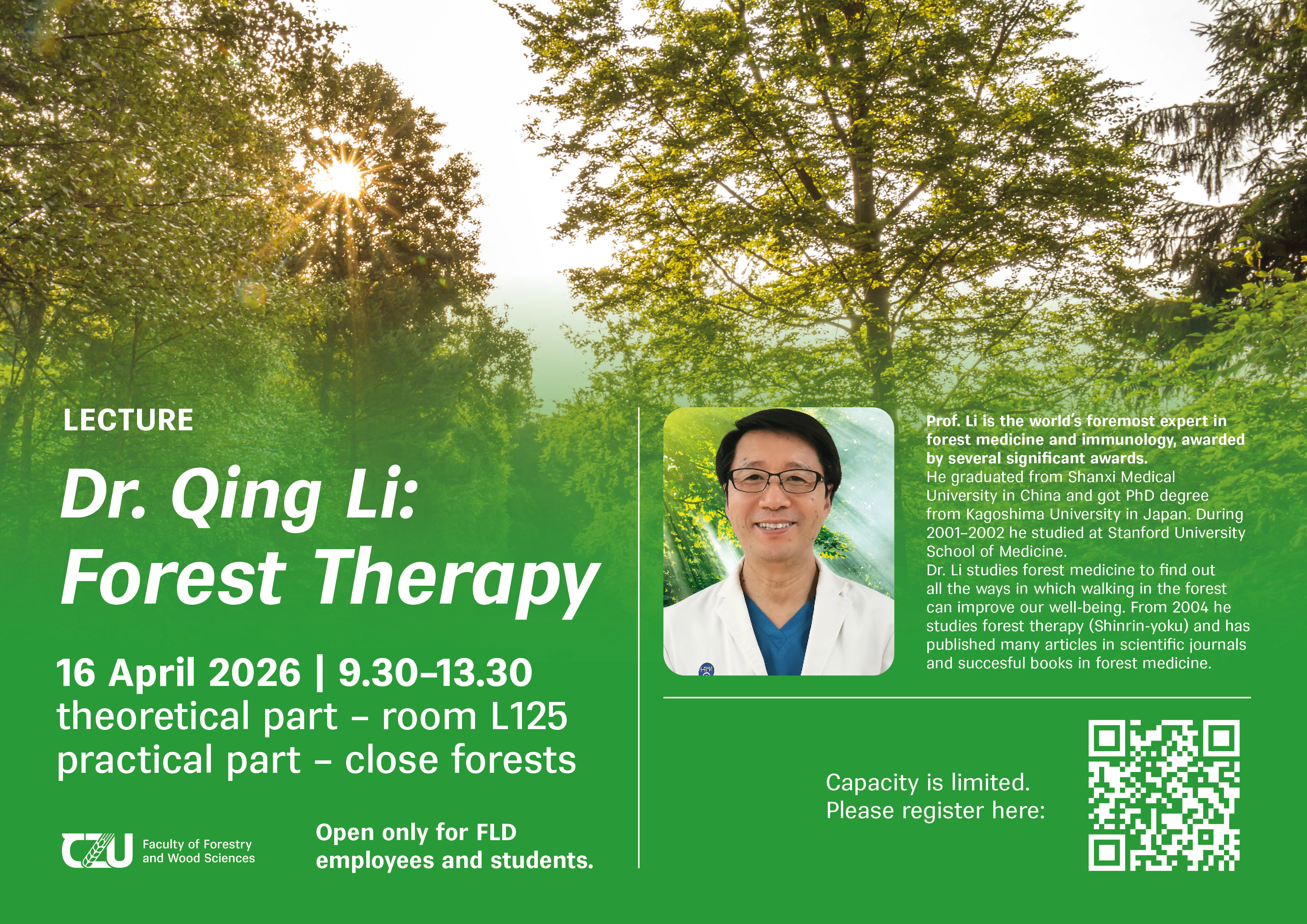 Zveme Vás na přednášku Lesní terapie Dr. Qing Li, která proběhne v anglickém jazyce. Bude se konat 16. dubna 2026 od 9.30 do 13.30 hodin v místnosti L125 a v přilehlých lesích.
