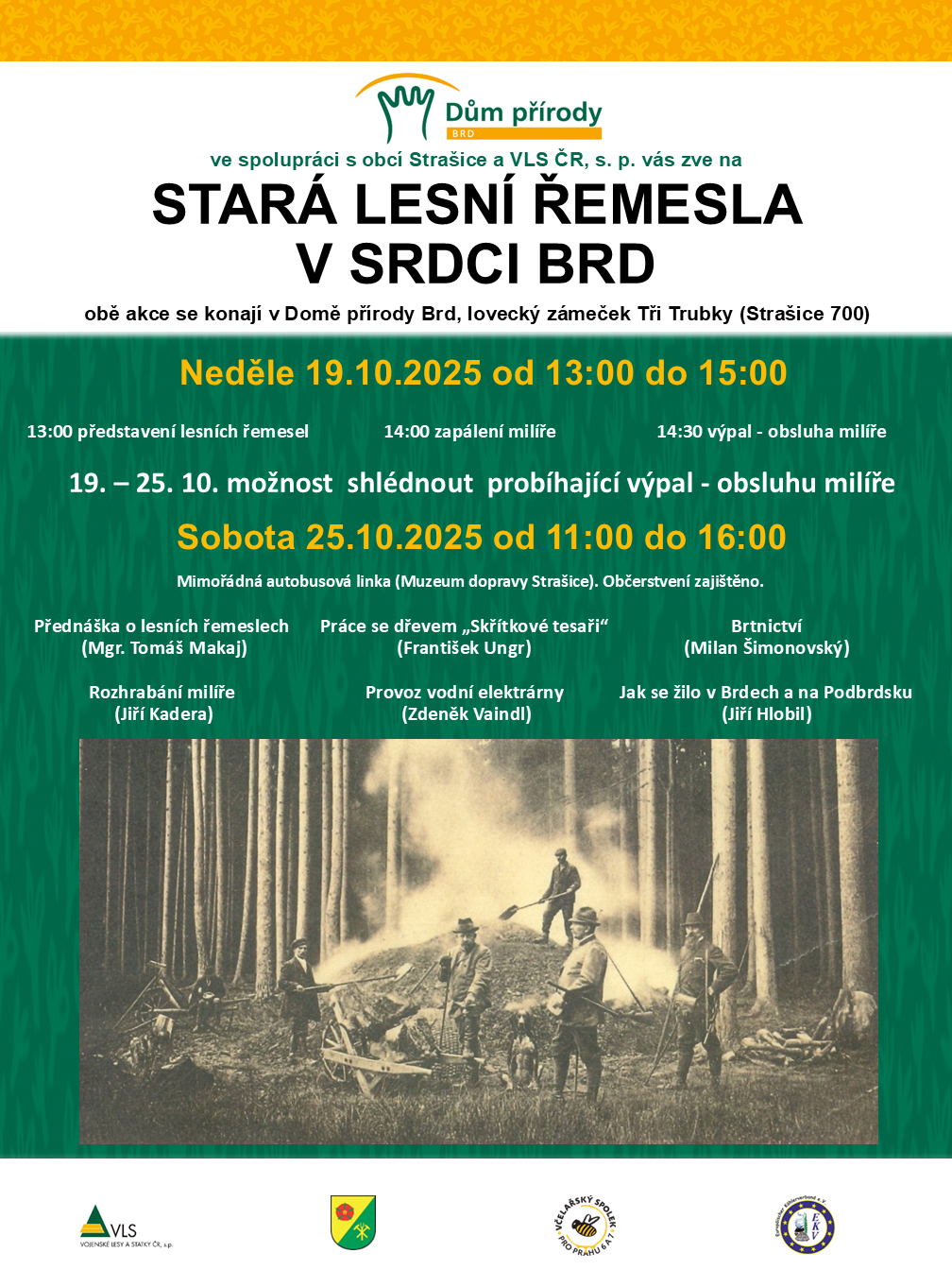 Zveme studenty i profesorský sbor na akci do samotného srdce Brd. Přijďte se podívat na ukázku starých lesnických řemesel v neděli 19. 10. a v sobotu 25. 10. 2025 do Domu přírody Brd, loveckém zámečku Tři Trubky.