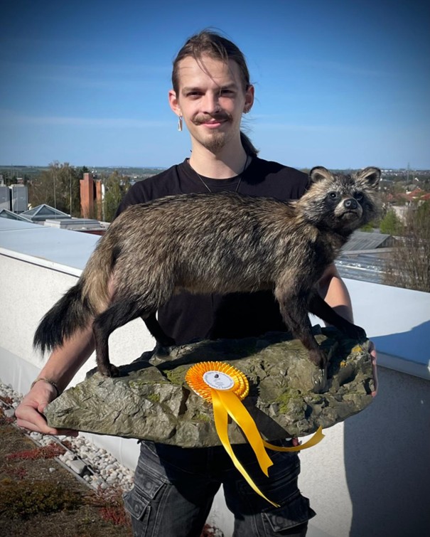 Bakalářská práce Karla Šmída preparace psíka mývalovitého s použitím vlastního navrženého modelu se zařazením novice division v kategorii large mammals s hodnocením 70 bodů a ocenění v podobě žluté stužky.