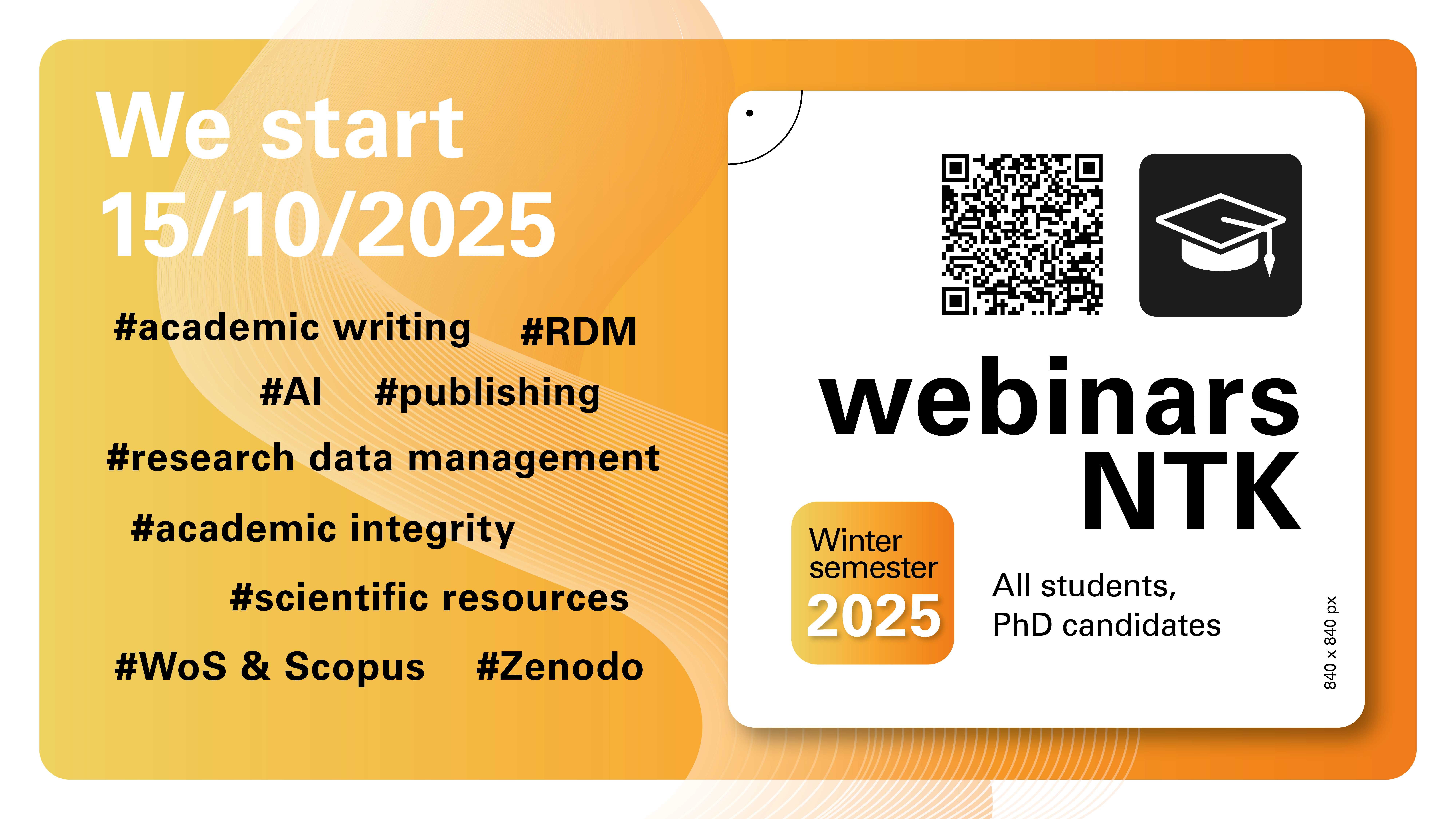 The National Library of Technology (NTK) invites students, PhD candidates, and early career researchers to join our free webinars. In English (with additional Czech sessions), we’ll help you navigate scholarly resources, cite properly, write your first article, manage research data, and address academic integrity.